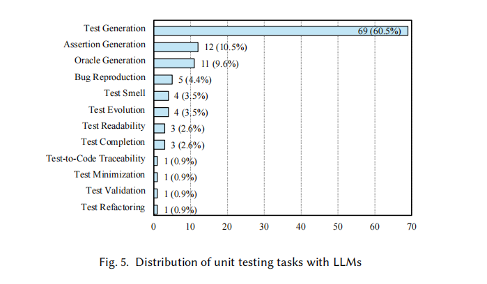 从这里大致可以看出现在大家在做什么,包括“写测试代码”(Test Generation),还有“生成断言”(Oracle Generation)、“修复旧测试”(Test Evolution)、“测试代码补全”等等。