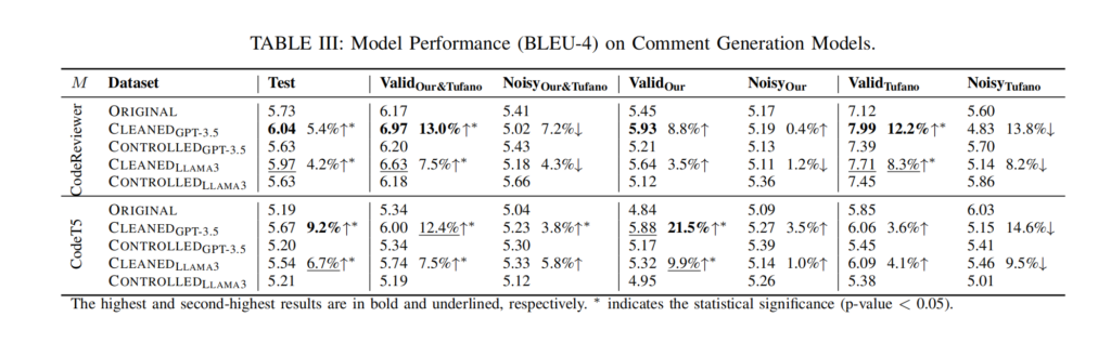 文章发现,直接用 LLM(如 GPT-3.5 或 Llama 3)清洗掉这些噪声后,虽然训练数据量减少了 25% – 66%,但训练出来的模型 BLEU 分数反而提升了 13% 左右。